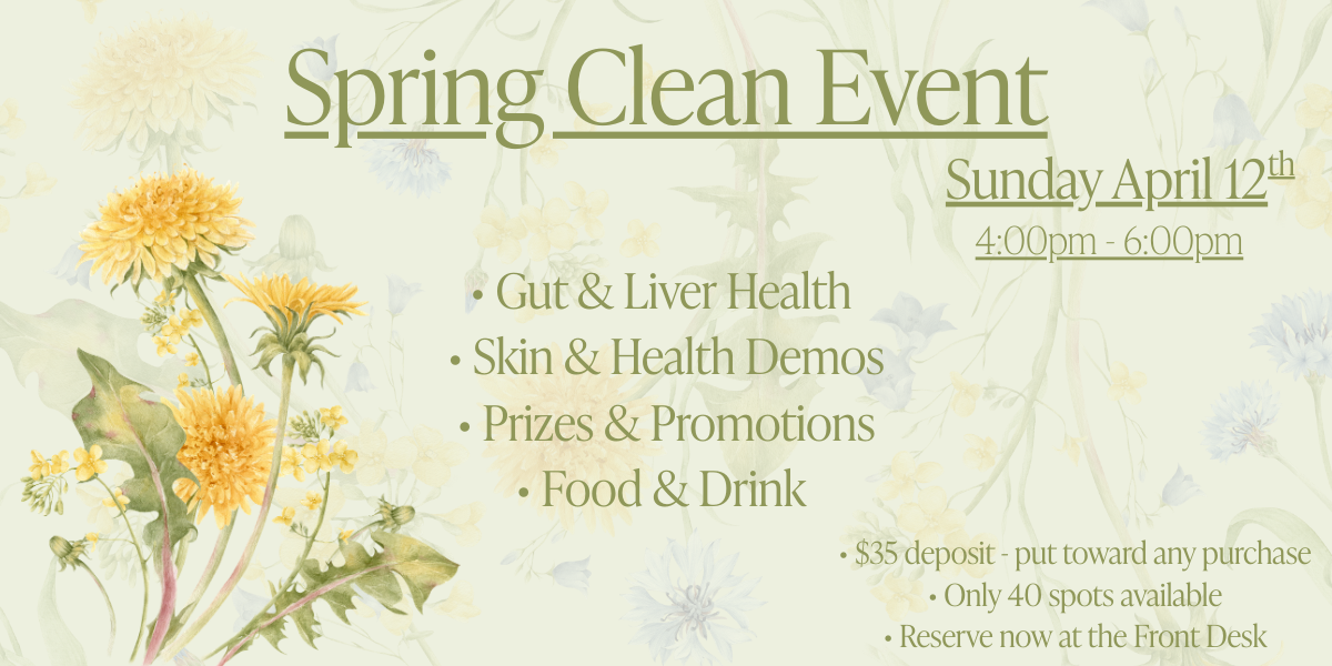 We are celebrating spring time with our Spring Clean Event! This is an open house with demonstrations, promotions, prizes, and fun food and drinks to celebrate this time of year! In Traditional Chinese Medicine, Spring time represents care for the liver and focusing on the transition from winter. Come celebrate and learn more about your health with us!
